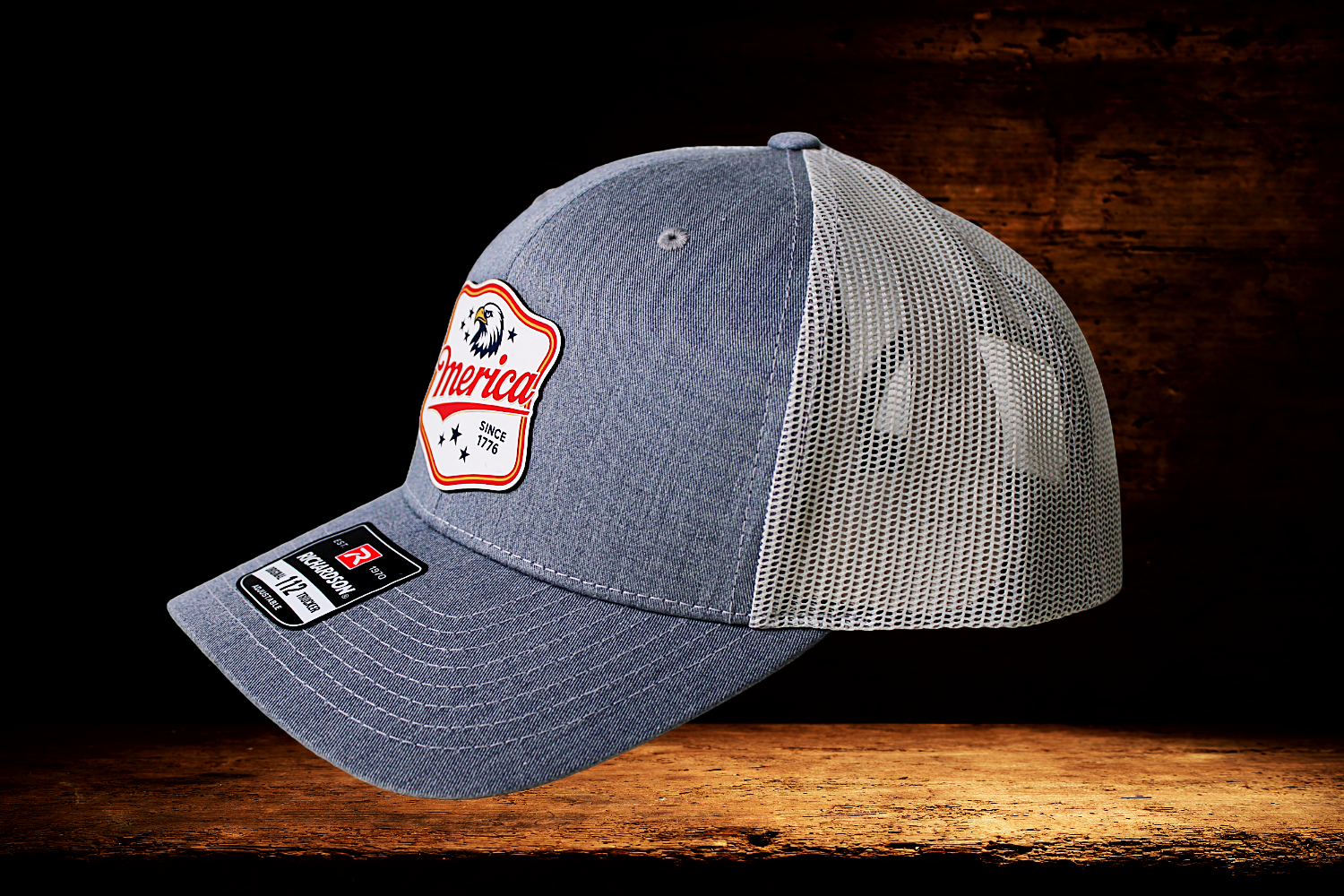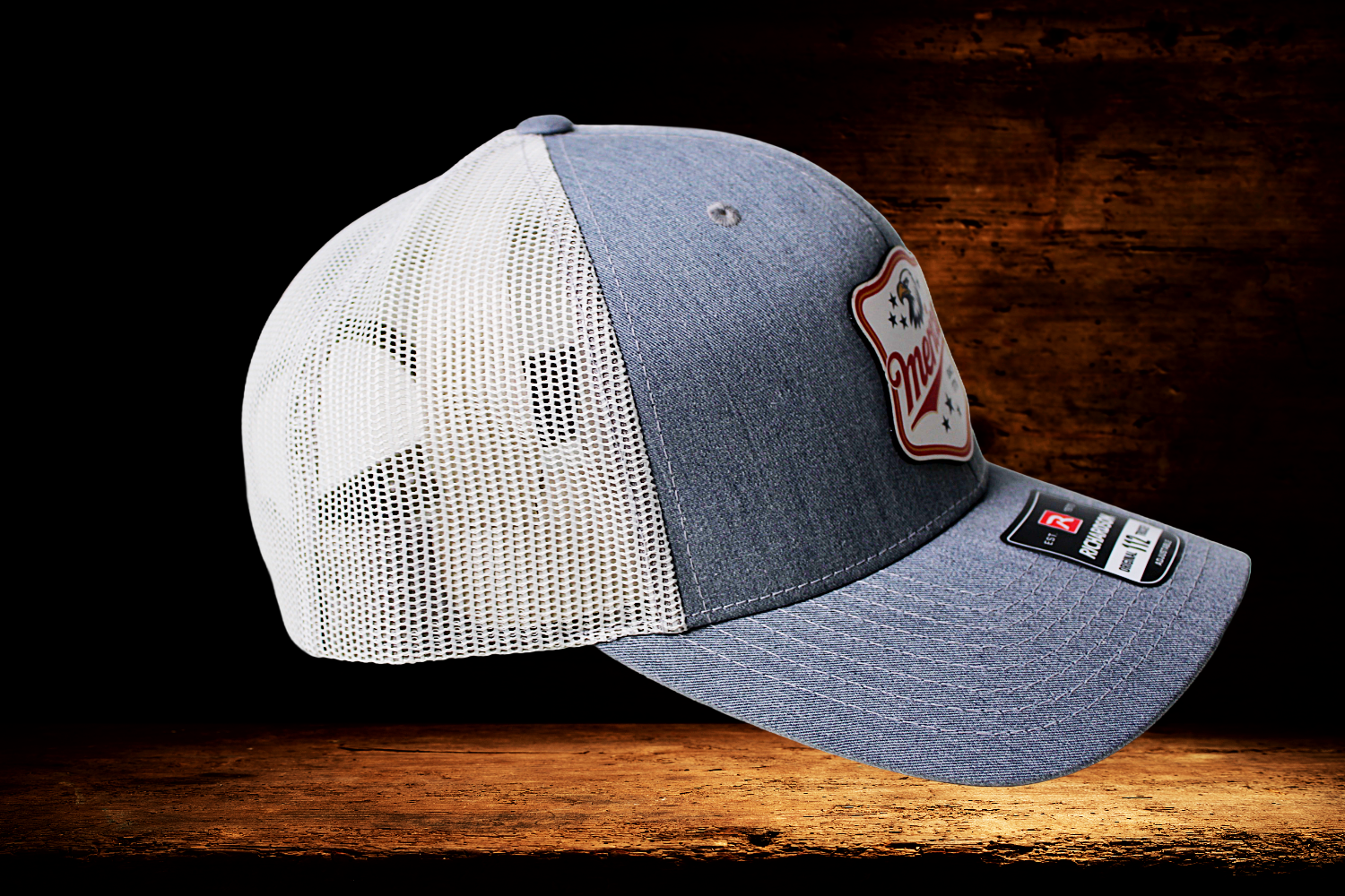 Richardson 112 heather gray and white with 'Merica and eagle patch